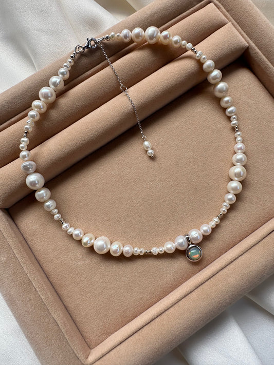 Freshwater Pearl Necklace with Opal Pendant – 925 Sterling Silver, Rhodium Plated